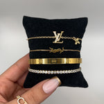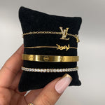 CANNES sættet udstråler ren elegance med den raffinerede kombination af gyldne armbånd og glitrende detaljer. Den perfekte blanding af stil og klasse – ideel til både en chic aften og dit daglige look. Vandafvisende og hypoallergen, så du hver dag bekymringsløst kan udstråle et strejf af Cannes-allure.