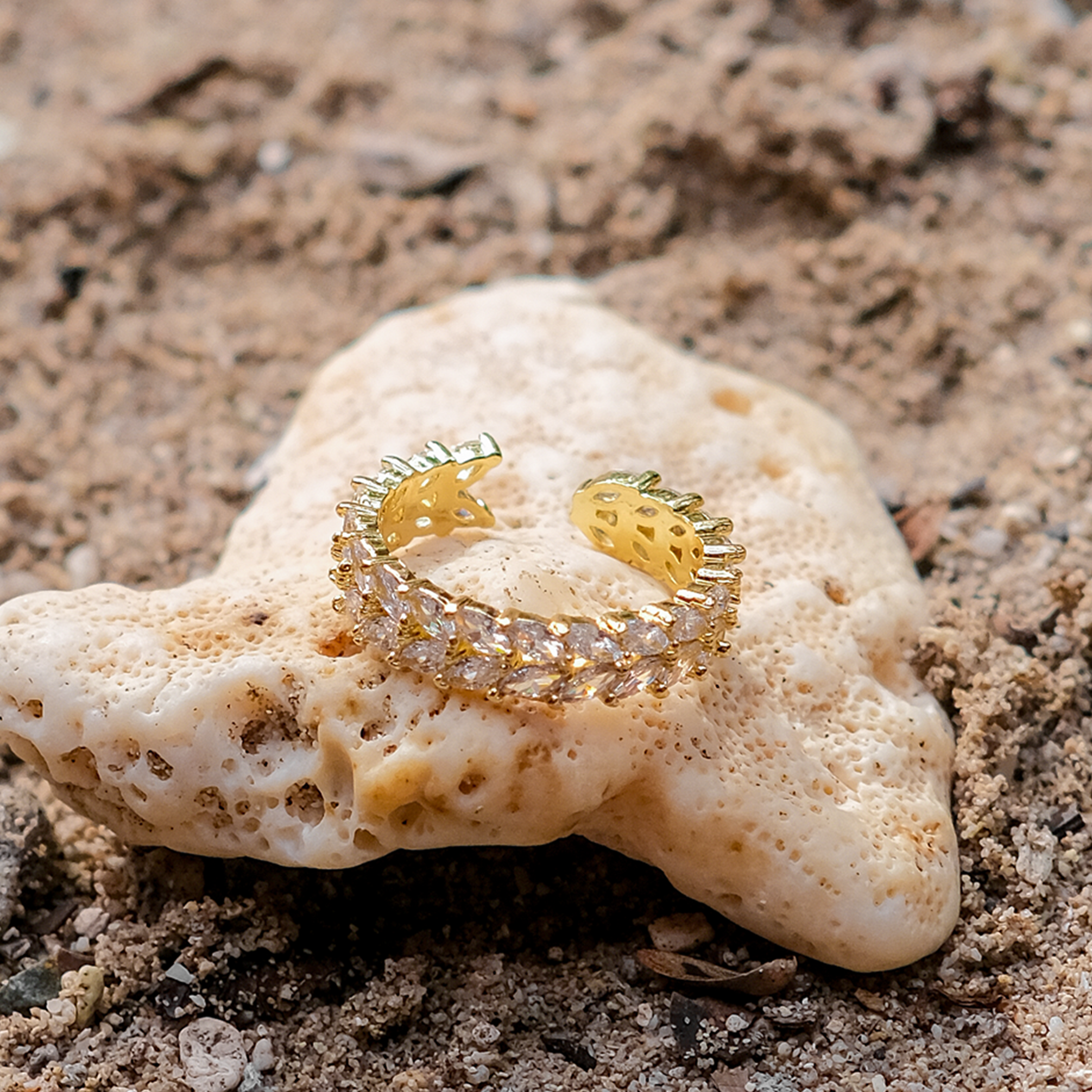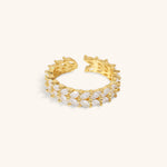 Clarisse er et stilfuldt og sofistikeret smykke, der tilføjer et strejf af glamour til dit look. Den har en guld ring med et åbent design indlejret med diamant simulater, der funkler som diamanter.
