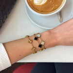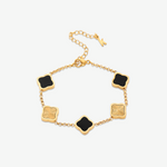 CLOVER Guld Armbånd udstråler elegance og raffinement med sine glitrende sorte kløverdetaljer. Et klassisk design, der ubesværet passer til ethvert outfit – fra daglig chic til aftenstil. Vandafvisende og hypoallergen, designet til at kombinere luksus og komfort hver dag.