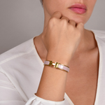 HELENE Elegant Armbånd er et raffineret tilbehør, der kombinerer et luksuriøst udseende med et moderne design. Den glatte gyldne finish, kombineret med de hvide detaljer, gør dette armbånd til et alsidigt valg, der kan bæres både dagligt og til specielle lejligheder. Designet er både stilfuldt og tidløst, og det etisk fremstillede rustfrit stål med en 18k guld finish sikrer langvarig holdbarhed.