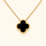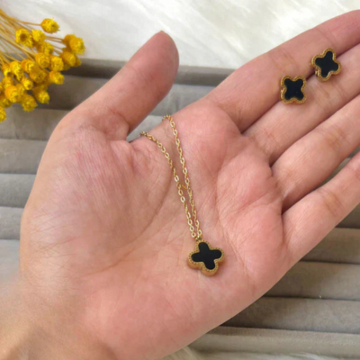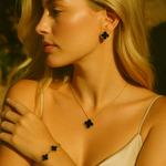 Dette betagende sæt med kæde, armbånd og øreringe bringer tidløs klasse med et moderne twist. Den ikoniske sorte firkløver, indrammet i raffineret guld, udstråler subtil luksus – perfekt til daglig brug eller som en stilfuld afslutning på en aften fuld af elegance. Armbåndet i dette sæt leveres med en justerbar forlængerkæde for en perfekt pasform.