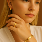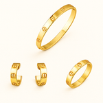 Et kraftfuldt, minimalistisk sæt bestående af et armbånd, øreringe og ring – hver med de genkendelige skruedetaljer, der udstråler tidløs klasse. Denne ikoniske kombination står for ren elegance og moderne design, perfekt til dem, der elsker subtil luksus og raffinement i hver bevægelse.