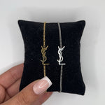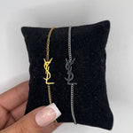 YSL Armbåndsættet består af to elegante armbånd i guld og sølv – en tidløs kombination, der ubesværet passer til ethvert outfit. De subtile initialer tilføjer et strejf af moderne elegance, mens det minimalistiske design giver et luksuriøst, stilfuldt udseende. Perfekt til at bære sammen eller hver for sig til enhver lejlighed.
